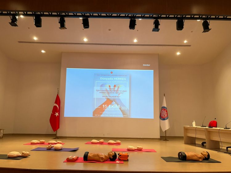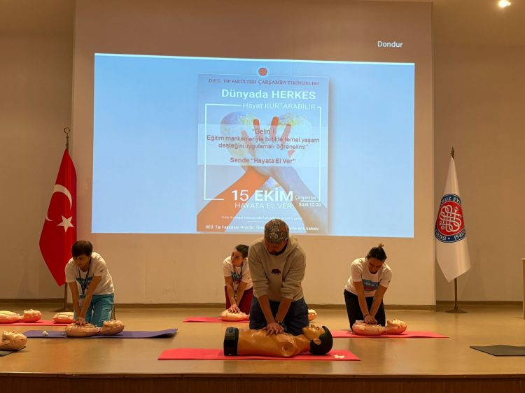Dokuz Eylül Üniversitesi Tıp Fakültesi Sosyal Kültürel Etkinlikler Kurulu tarafından düzenlenen Çarşamba Etkinlikleri kapsamında, 15 Ekim 2025 tarihinde “Temel Yaşam Desteği Farkındalığı” etkinliği gerçekleştirildi. Etkinlikte, Anesteziyoloji ve Reanimasyon Anabilim Dalı Öğretim Üyesi Prof. Dr. Şule Özbilgin tarafından, Prof. Dr. Bahar Kuvaki ve ekibinin desteğiyle, eğitim mankenleriyle uygulamalı temel yaşam desteği eğitimi verildi. Katılımcılar, kalp masajı ve acil müdahale basamaklarını uygulamalı olarak deneyimleyerek, “Dünyada herkes hayat kurtarabilir!” mesajını hep birlikte vurguladılar.